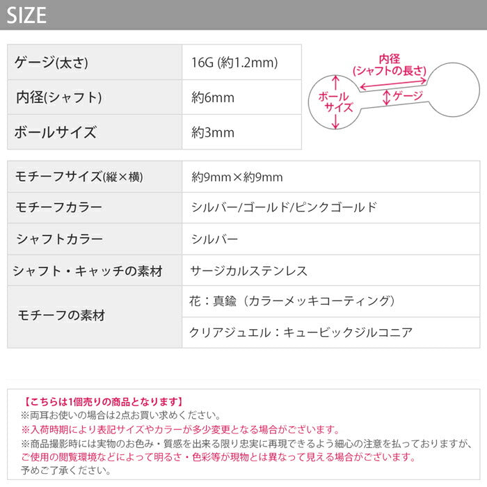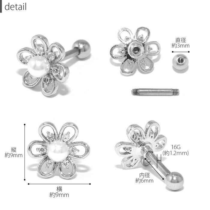 t9192-084 軟骨ピアス 16G ボディピアス かわいい キャッチ チャーム サージカルステンレス 金属アレルギー対応 キュービックジルコニア 花 フラワー パール ジュエル キラキラ ストレートバーベル 軟骨用 花びら シルバー ゴールド ピンク なんこつぴあす 片耳用