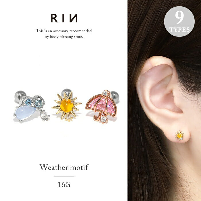 ボディピアス 軟骨ピアス 16G ピアス 金属アレルギー サージカルステンレス シルバー ゴールド ピンクゴールド ジュエル キュービックジルコニア 天気 太陽 雲 傘 つけっぱなしピアス ストレートバーベル レディース シンプル ボディピ 可愛い アクセサリー 片耳用