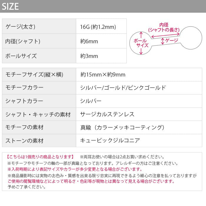 ※こちらの商品の一部カラーは、サージカルステンレスの上にカラーのメッキコーティングを施しています。体質によって着けたままにされますと、メッキコーティングが剥がれる可能性がございます。