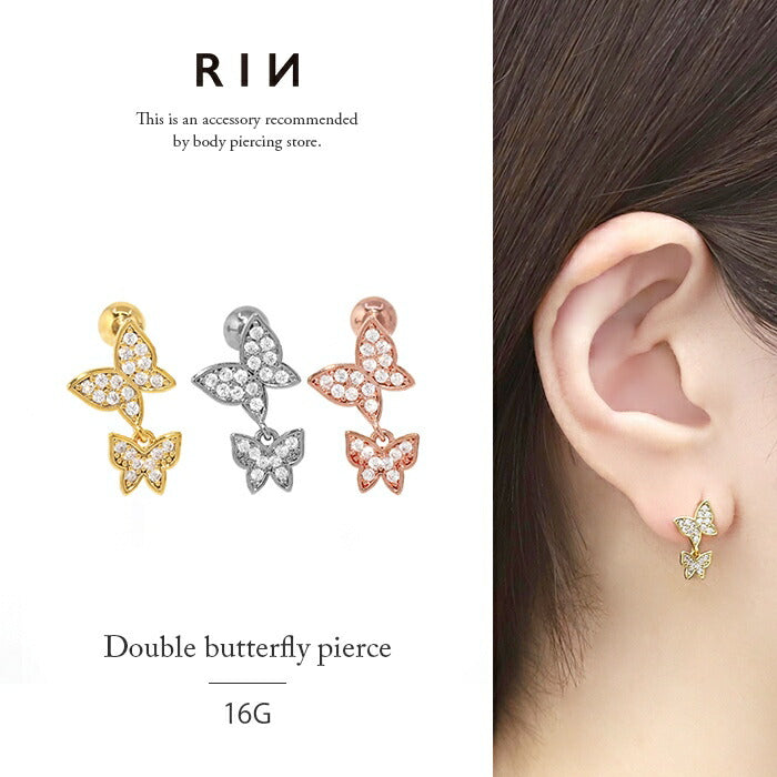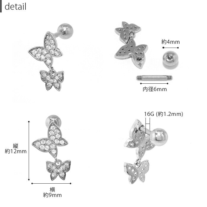 16G 蝶々 ダブル キュービックジルコニア ジュエル ボディピアス ストレートバーベル 軟骨チャーム付0220 t9312-30