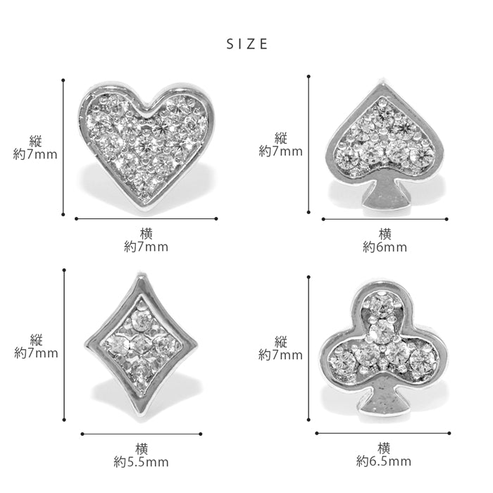 | モチーフサイズ(縦×横) | ハート:約7mm×約7mm スペード:約7mm×約6mm ダイヤ:約7mm×約5.5mm クローバー:約7mm×約6.5mm |