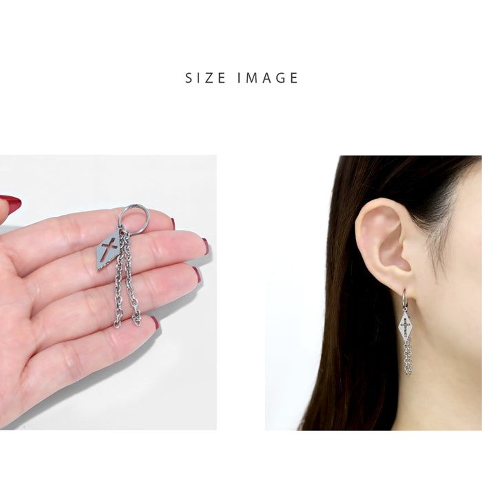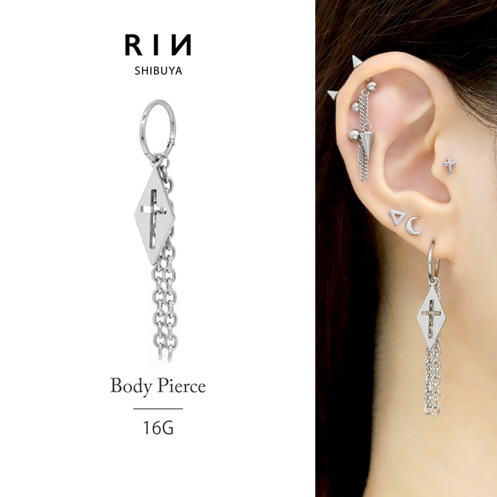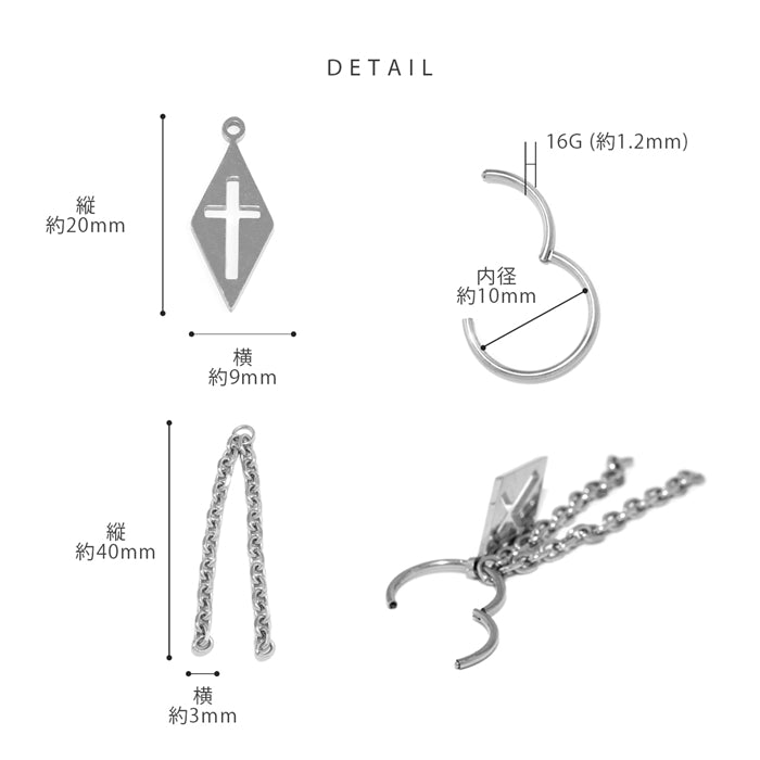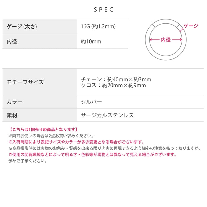 16G リングピアス ワンタッチフープ クロス チャーム 十字架 チェーン 片耳用 ステンレスピアス0056 t951-0045