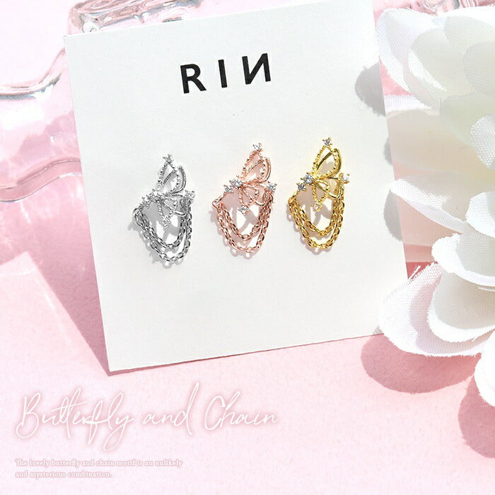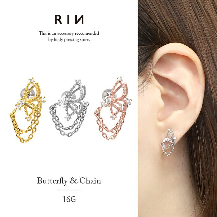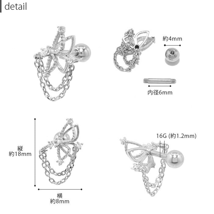軟骨ピアス 16G ボディピアス ピアス 金属アレルギー サージカルステンレス 蝶 バタフライ キャッチ チャーム かわいい シンプル ジュエル キラキラ シルバー ゴールド ピンクゴールド セカンドピアス ストレートバーべル チェーン 片耳用