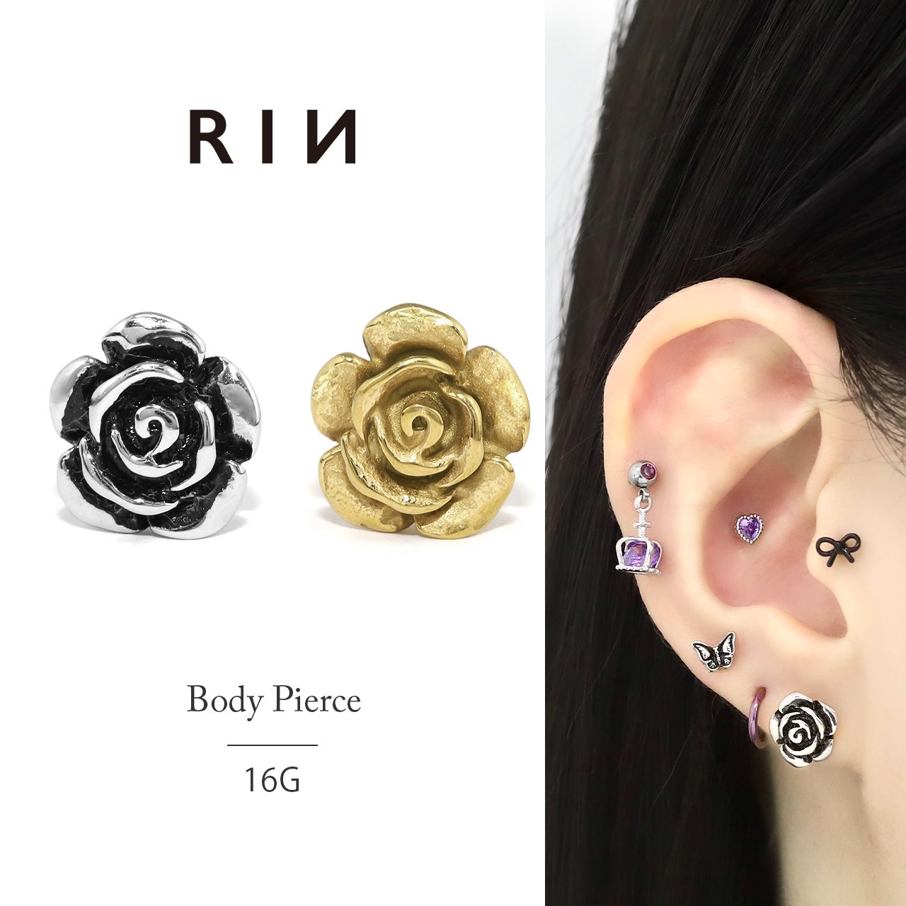 w1f-118-11 軟骨ピアス 16G ボディピアス バラ ローズ 薔薇 花 アンティークローズ 金属アレルギー ストレートバーベル ピアス サージカルステンレス 片耳用