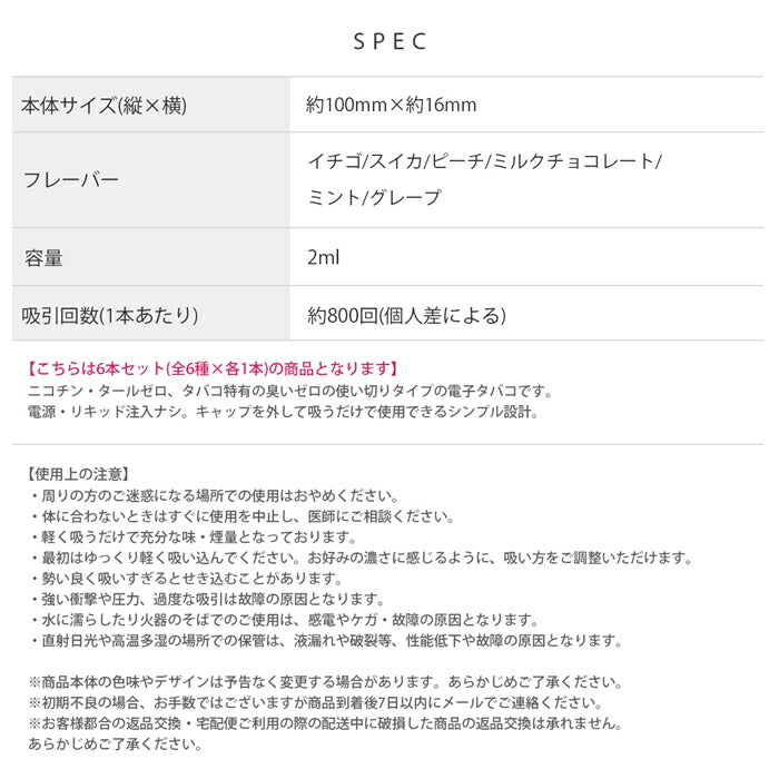 ニコチン・タールゼロ、タバコ特有の臭いゼロの使い切りタイプの電子タバコです。 電源・リキッド注入ナシ。キャップを外して吸うだけで使用できるシンプル設計。